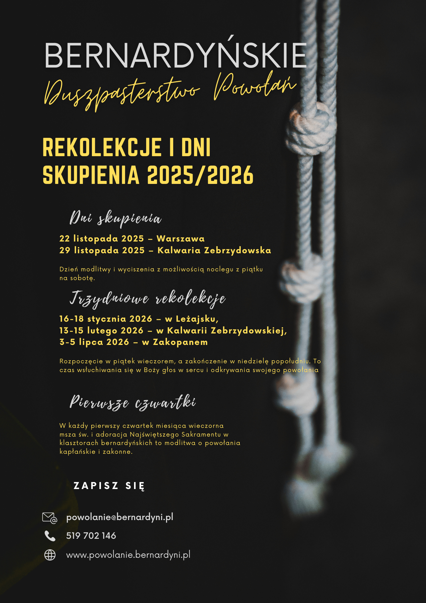 Rekolekcje dla kandydatów do Zakonu, na które zostaną zaproszeni zgłaszający się do referenta (po odbyciu stosownej rozmowy), odbędą się w Kalwarii Zebrzydowskiej, w okresie wakacji. Konkretny termin zostanie podany później.